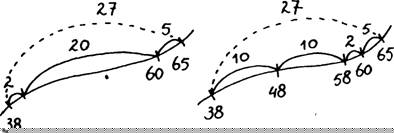 Hier staan vier oplossingsschema's maar er zijn natuurlijk meer mogelijkheden. Men kan de afdekking '65 - 38' immers ook opvatten als het verschil tussen 65 en 38, oftewel het overbruggen van de afstand tussen 38 en 65.